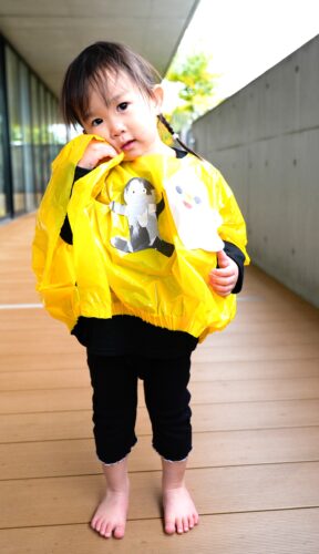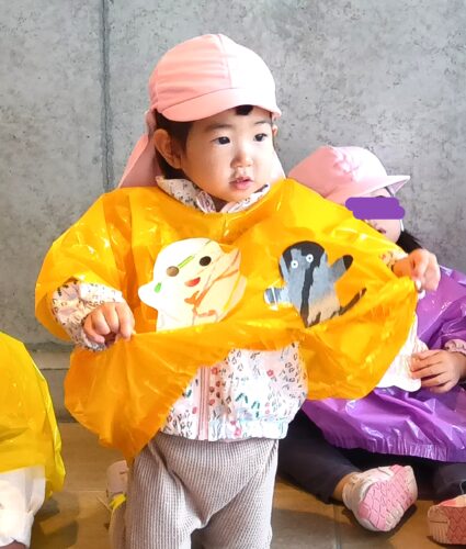 2歳児クラスは、同じく自分たちで飾りを作ったマントを身に付け、手作りバッグを手にお散歩に出かけます。