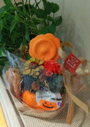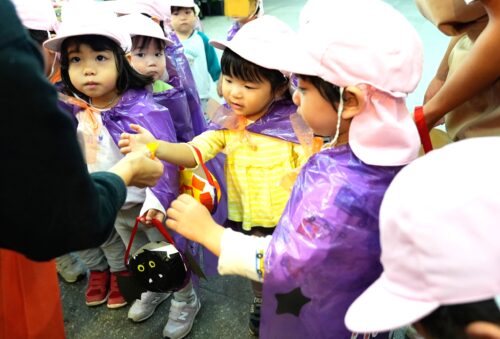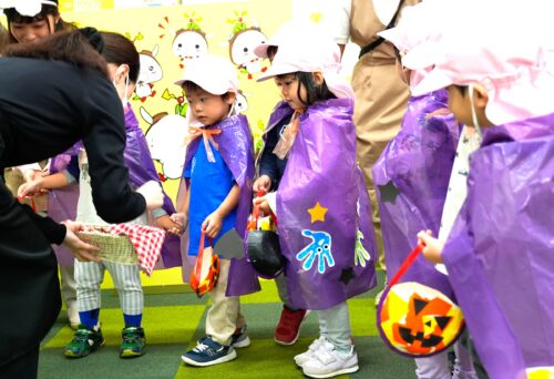 園があるビル内の施設や駅構内のお花屋さんに事前にお願いし、作り物のお菓子を子ども達に配っていただきました。