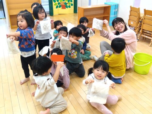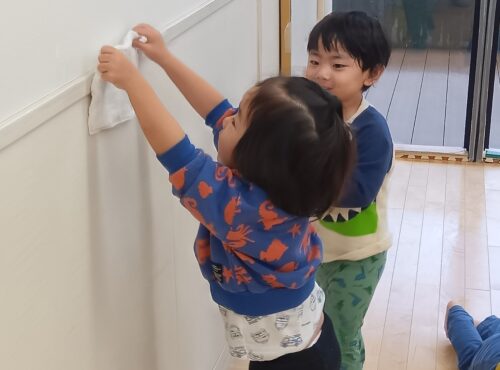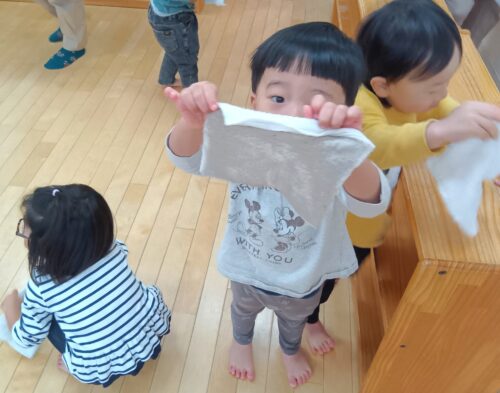 職員手作り、子どもの手にあったサイズの雑巾を持ち、お掃除開始です!