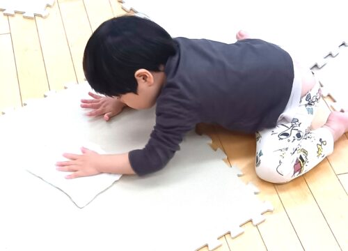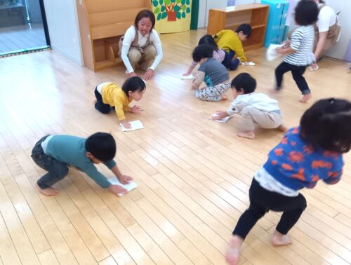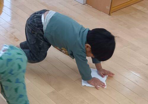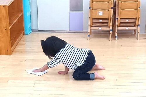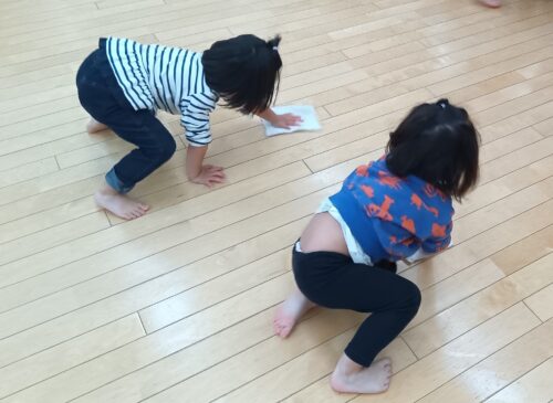 両手で進んでいく子、片手でゴシゴシ拭く子、スタイルは様々ですね。