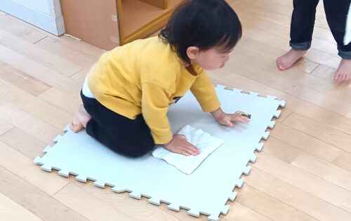 床に敷いてるジョイントマットも表裏きれいに拭いていきます。