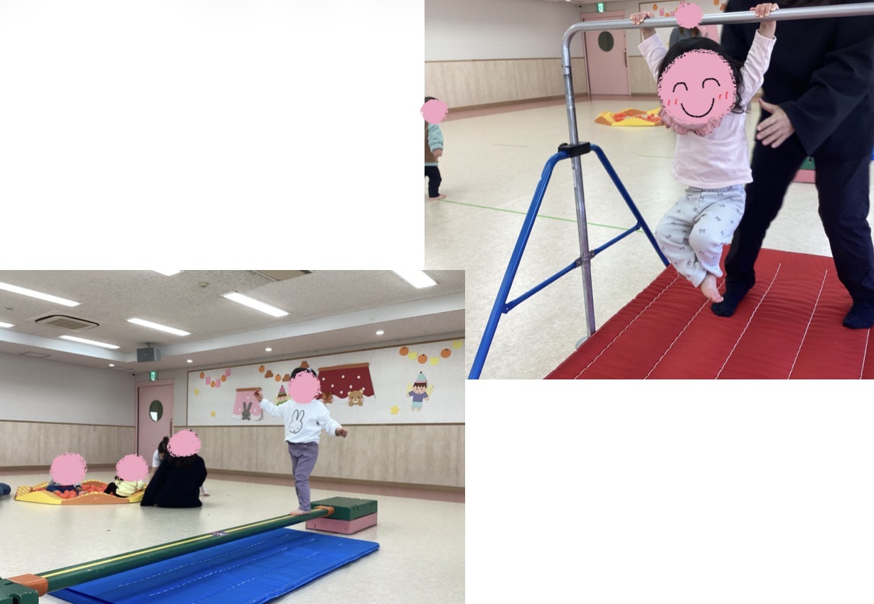 平均台、鉄棒、滑り台、ボールプールの4種類の遊びがあり、どの子も目を輝かせて好きな遊びを見つけて夢中になっていました。