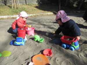 砂遊びでトラックいっぱいに砂を入れ荷台を倒して砂をバケツの中に移動させたり、