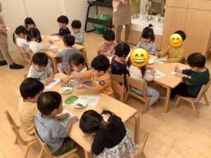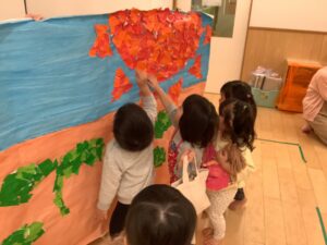 背景の葉っぱは子どもたちの手作り!動物たちが住む森をイメージして、色塗りを楽しみました。
