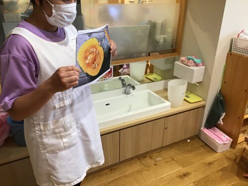 食欲の秋!ということでこあら組はエプロンと三角巾をつけてかぼちゃサンド作りを行いました。
