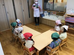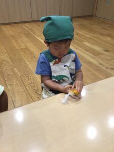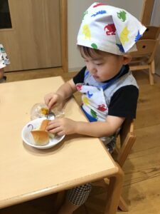 食欲の秋!ということでこあら組はエプロンと三角巾をつけてかぼちゃサンド作りを行いました。