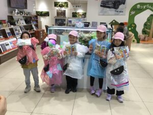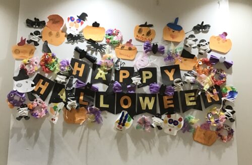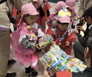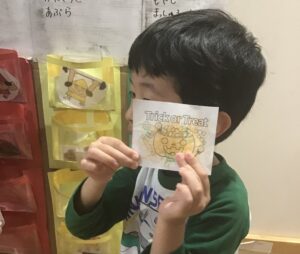 トリックオアトリート!と言い、シールを貼ってもらったり、プレゼントを頂いています🍬