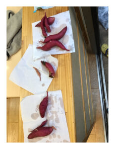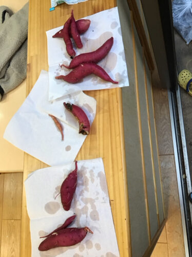 最後はみんなで収穫したさつまいもをお部屋に置いて甘くなーれと天日干し🍠