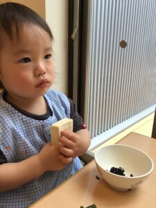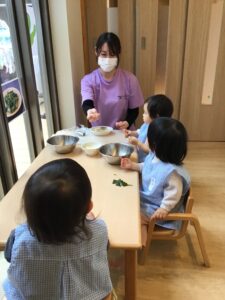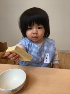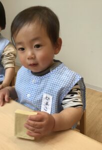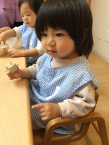 離乳食が終わり、完了食に上がったひよこ組さん。最近は毎月食育活動に参加しています!