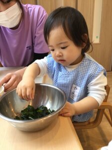 「わあ〜おおきいね!(水に戻したわかめ)」「つるつる!ざらざら!」と保育者やお友だちとお話もしながら楽しんでいました!