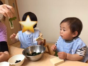 水に戻して大きくなったわかめやふにゃふにゃになった高野豆腐に触って確かめようと積極的に取り組んでいました!