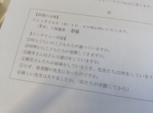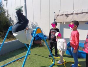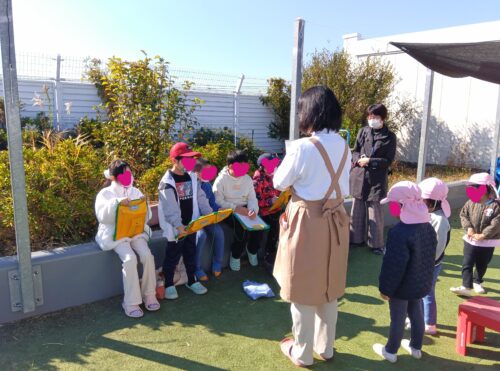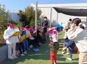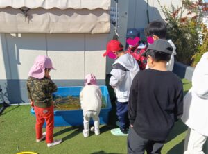 小学生「町たんけん」が来たよ~本園~ 2025.11.20 大森第三小学校の2年生が 「町たんけん」の学習で訪問してくれました。 目的は保育士へのインタビューでしたが、せっかくの機会でしたので交流してもらいました。 卒園生もいて、かつての担任と感動の再会も出来ました。 小学生に興味津々の3歳児うさぎ組の子どもたち。 みんなに交じって小学生も並びます。「すごいなあ」と憧れの眼差しで見ています。 「何を飼ってるの?」「金魚だよ」緊張もほぐれて自然に会話も出来ました。