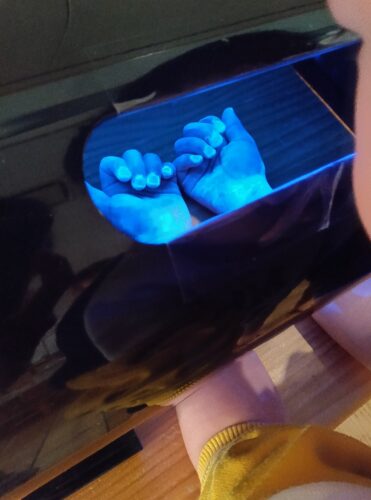 さあ、いよいよブラックライトの出番です。照らしてみると、光っているところがいっぱい。