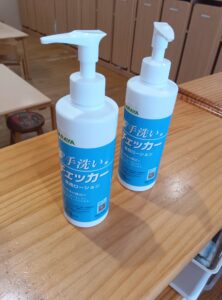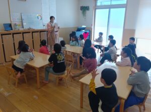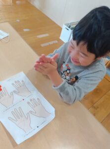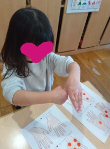 康教育の一環で、5歳児クラス(きりん組)で「きれいな手の洗い方講座」を看護師が実施しました。