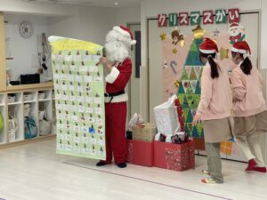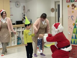 みんなからサンタさんに質問をしたり、サンタさんにお願いしたお手紙をお渡しし、サンタさんとの交流を楽しみ、待ちに待ったサンタさんから各クラスへプレゼント🎁がありました!