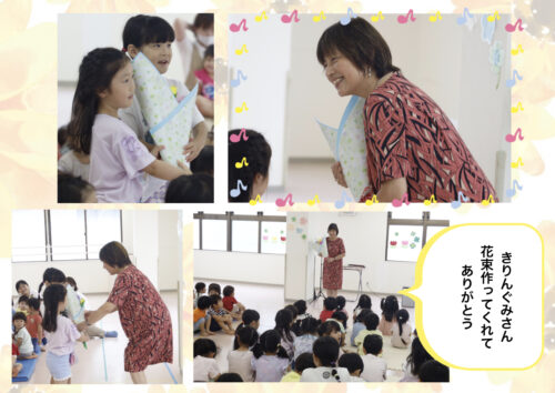 演奏してくれたお礼にきりん組のお友だちから花束のプレゼントを渡しました。