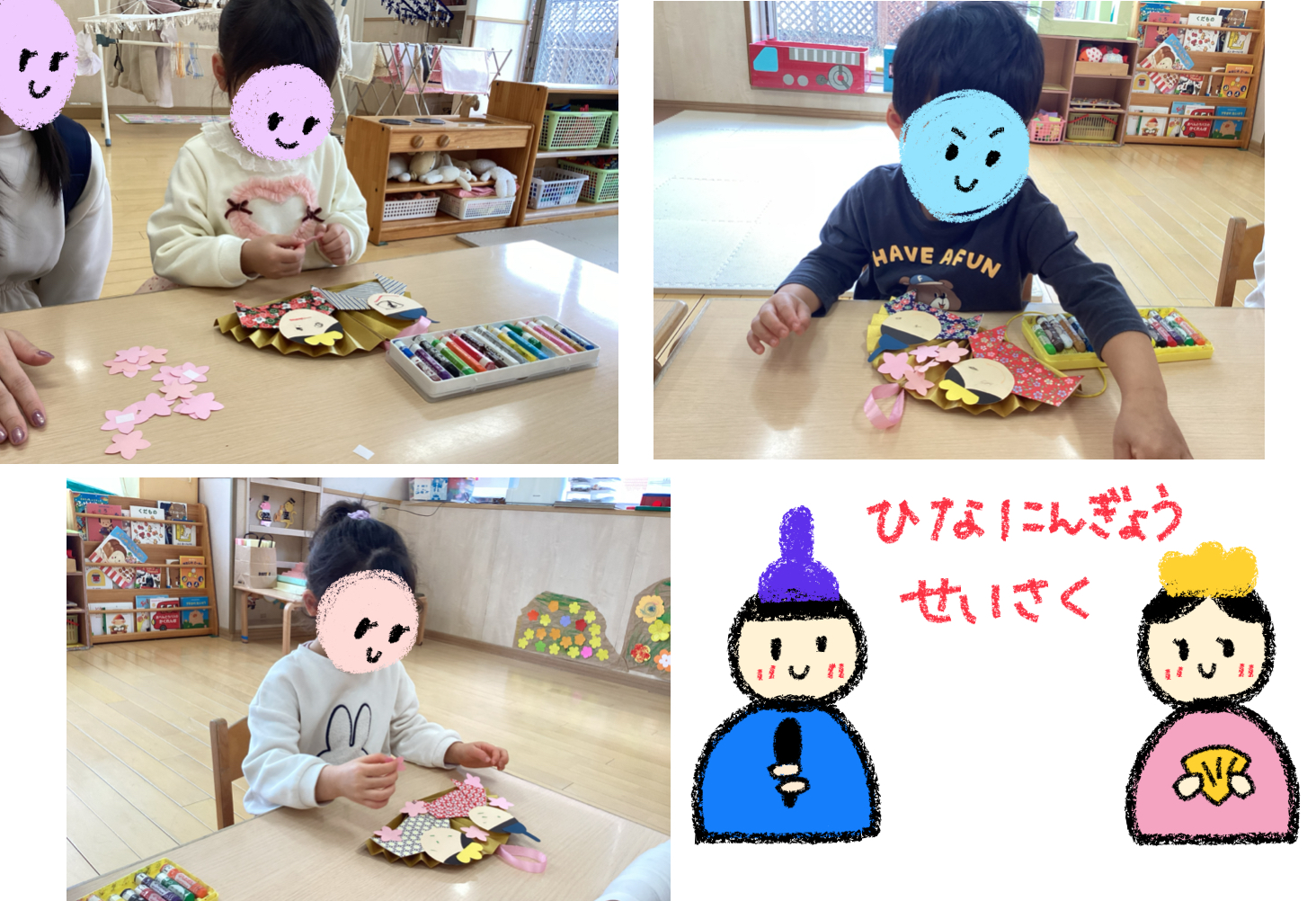 クレヨンでお顔を描いたり、桃の花を貼ったりと夢中になり取り組んでいました。