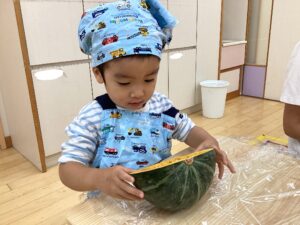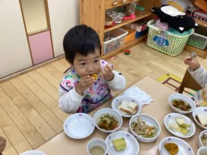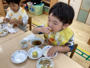 「これ〇〇がつくったんだよ!」「おいしいね!あまいね」など
