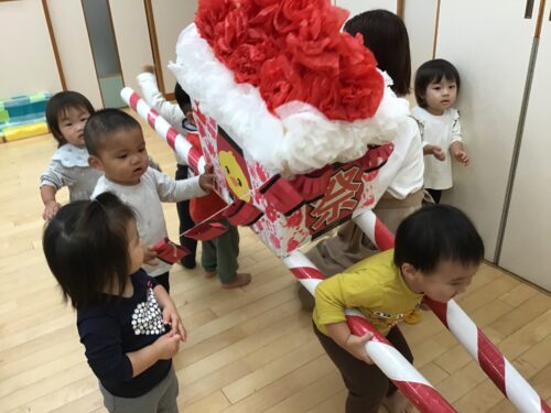 りす組では夏祭りの時に使ったおみこしを室内遊びに取り入れて楽しんでいます♪
