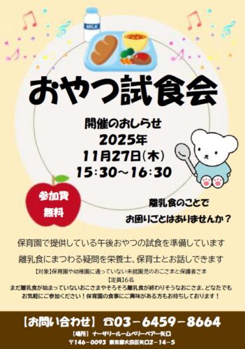 おやつ試食会のご案内 2025.11.7 15:30~16:30 はじめておやつ試食会を 行います‼ 離乳食のことや保育園のおやつのこと 実際におやつを食べながら 栄養士や保育士とお話しませんか?♡ お気軽にご参加お待ちしております🍩