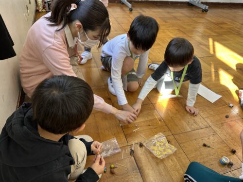 どんぐりを使った遊びに 夢中なこどもたちと