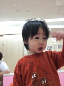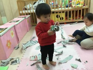 新聞紙を破いたり、丸めたり細かくちぎって見るなど指先を上手に使っています!大きな新聞紙を『びぃびぃ』とお話ししながら一生懸命に破いていますよ😁