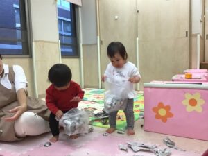 新聞紙遊びを楽しむひよこ組のお友だち🐤