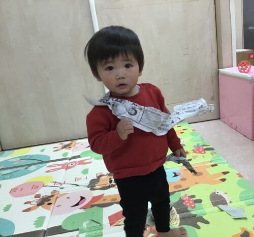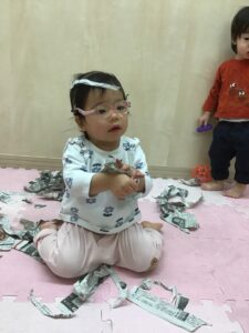 新聞紙を破いたり、丸めたり細かくちぎって見るなど指先を上手に使っています!大きな新聞紙を『びぃびぃ』とお話ししながら一生懸命に破いていますよ😁